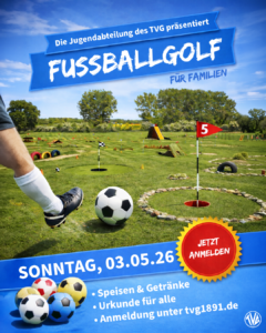 TVG Fussballgolf Unter dem Motto „Lerne die Fußball-Jugendabteilung des TVG kennen“ veranstalten wir am 03. Mai zum ersten Mal ein ganz besonderes Event: Fußballgolf auf